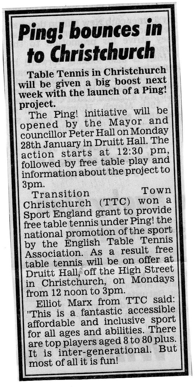 Further to Julie’s post of 22nd Jan, the article below appeared in this weekend’s New Milton Advertiser alongside the New Milton TTC report. Well done to Elliot Marx and her fellow volunteers for giving this boost to local Table Tennis!
