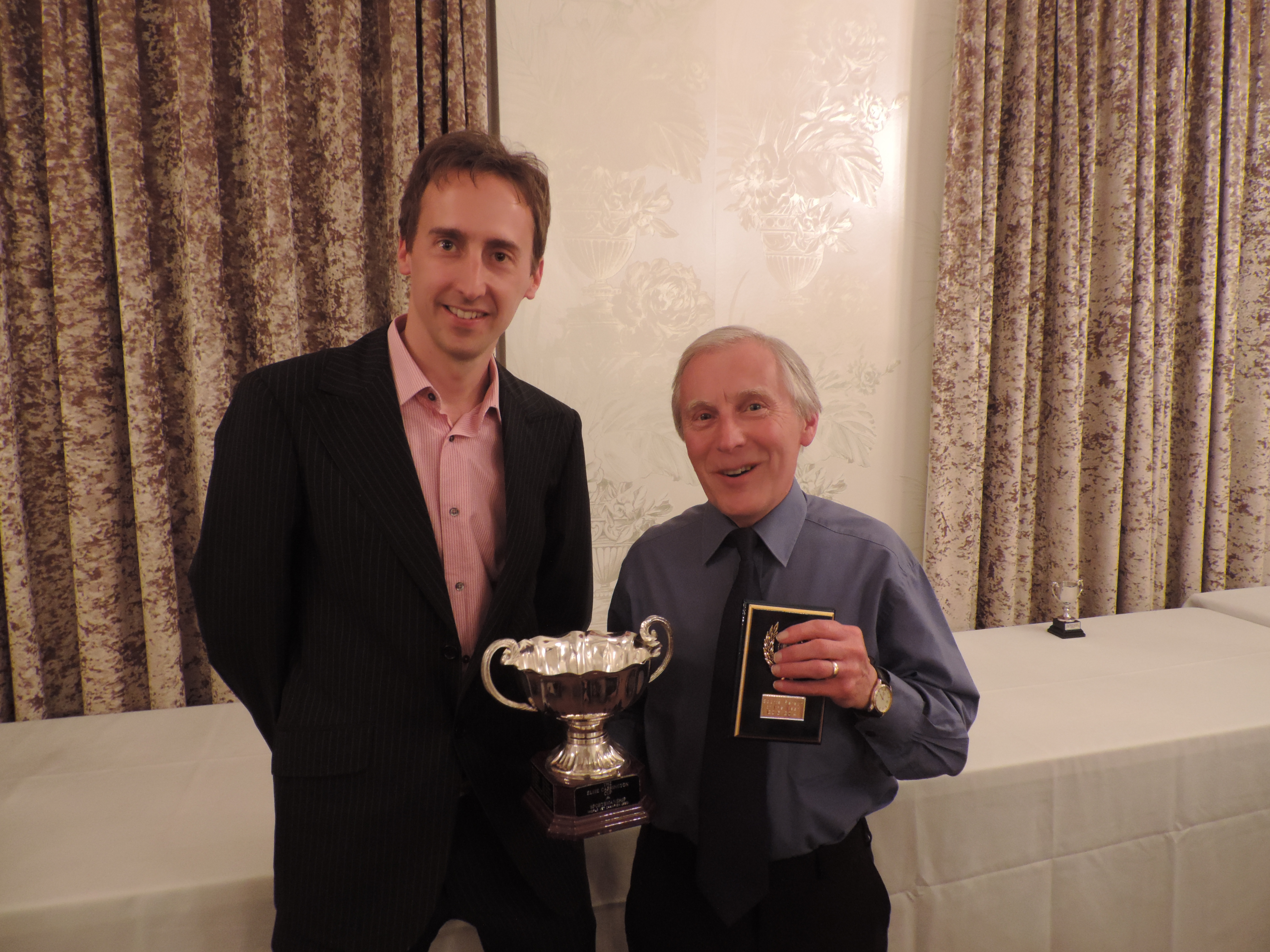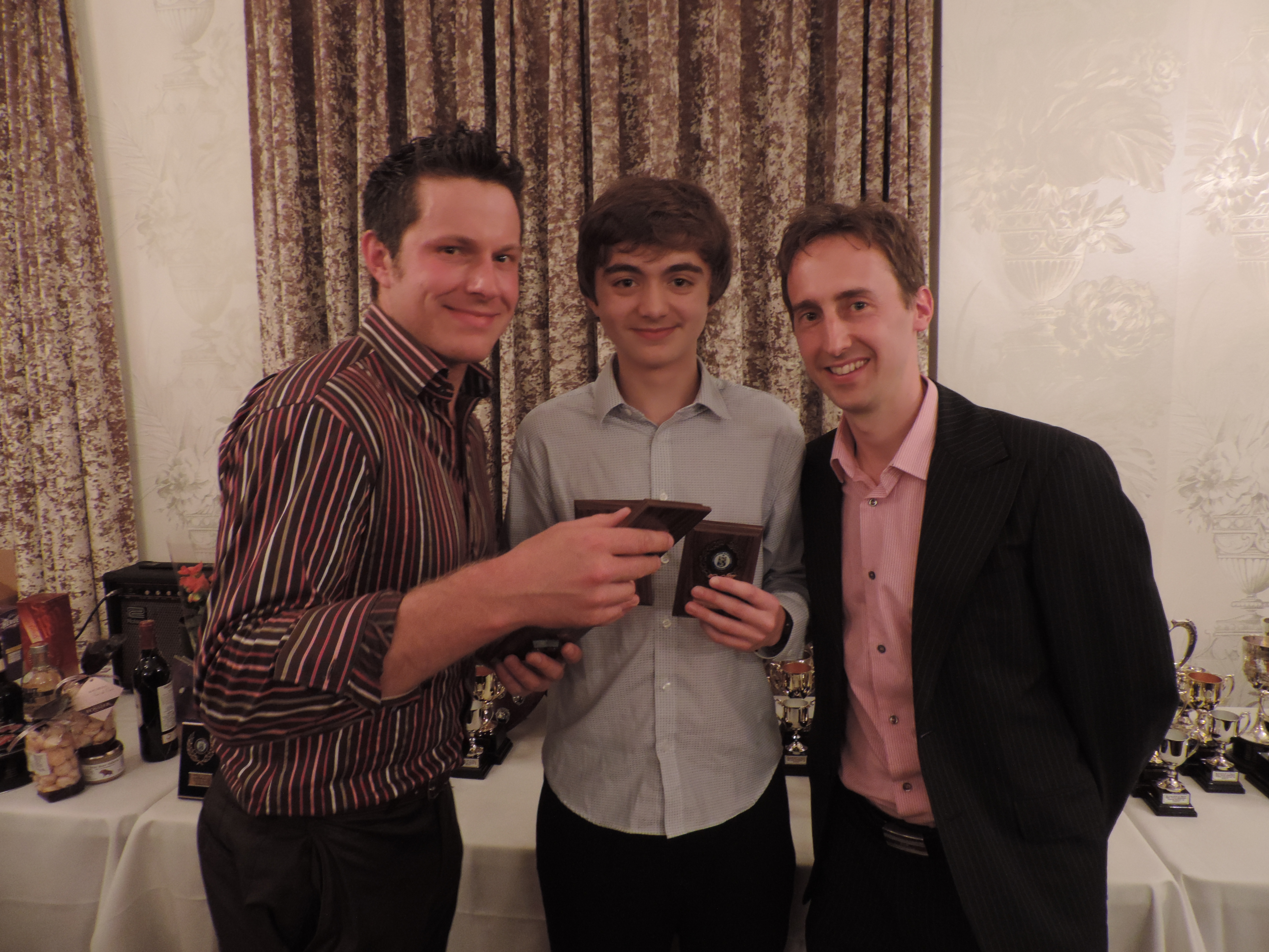 After an excellent meal, Alex Perry gave a truly inspirational speech and then proceeded to present the trophies under the watchful eye of Association General Secretary Gordon White. First up for the New Milton Club were Matthew Daish and Phil Handy who picked up the Times and Directory Handicap Cup runners-up trophy on behalf of the A team (their plan didn’t quite come together!). Matthew had to return to the front a bit later to pick up his Junior Under 15 winner’s trophy.