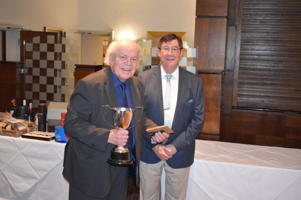 This accolade recognised Bev’s sterling work on the Bournemouth and District Management Committee, especially for keeping the Pairs League going over the past season, and as a very efficient and proactive league club secretary. Bev has many strings to his bow; he is a County Umpire and Tournament Organiser, both skills being much in evidence on behalf of his club and the local leagues. Bev is pictured below having proudly received his trophy from guest of honour Charlie Childs, a Board Member of Table Tennis England (Bev is on the left!).